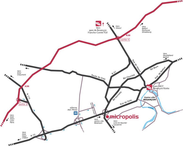 - Micropolis (à environ 300m de l'entrée Principale) : lignes T1 et T2 (tram) ; lignes 7, 51 à 59 et 84