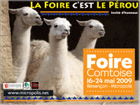 The Comtoise fair at Micropolis Besançon in France is without doubt the biggest commercial and festive gathering of the region Franche Comté, it accommodates 140 000 visitors and more than 450 exhibitors. The spaces for Habitat, Furniture, Gastronomy, Car, Motor and Water Sports, Planning of Outer Spaces, World’s Artisans, Agricultural Village and the Fairground Party take up an exhibition surface of 110 000 m². Every year this commercial dimension goes together with a cultural approach, thanks to the guest of honour: in 2009 it is Peru.