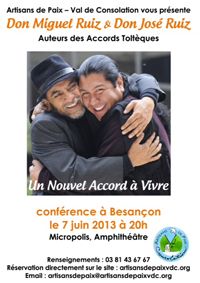 ven. 07/06/2013 2013-06-07 20:00:00 2013-06-07 20:00:00 Europe/Paris CONFERENCE DE DON MIGUEL RUIZ ARTISANS DE PAIX - VAL DE CONSOLATION vous présente : DON MIGUEL RUIZ & DON JOSE RUIZ CONFERENCE A BESANCON le 7 Juin 2013 à 20H Réservation di... Micropolis - 3 Boulevard Ouest 25000 Besançon ARTISANS DE PAIX - VAL DE CONSOLATIONr artisansdepaix@artisansdepaixvdc.org