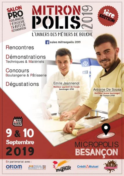 lun. 09 & mar. 10 septembre 2019salon professionnelMitronPolis Partager page facebook Emplacement : Hall D1 (Nord) Date(s) et horaire(s)lun. 09/09/2019 - 10:00 - mar. 10/09/2019 - 18:00 2019-09-09 09:00:00 2019-09-10 17:00:00 Europe/Paris MitronPolis Micropolis - 3 Boulevard Ouest 25000 Besançon Minoterie Mignotr Organisateur(s) Minoterie Mignot39800 Vaux sur polignyContact: M cédric Bertinsite officiel