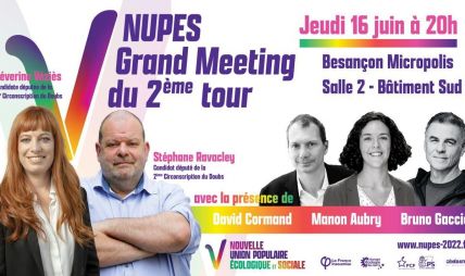 jeu. 16 juin 2022diversNUPES grand meeting du second tour Partager Emplacement : Hall E - Salle 2 (Sud) Date(s) et horaire(s)jeu. 16/06/2022 - 20:00 - 21:00 2022-06-16 19:00:00 2022-06-16 20:00:00 Europe/Paris NUPES grand meeting du second tour Micropolis - 3 Boulevard Ouest 25000 Besançon NUPESr Organisateur(s) NUPES