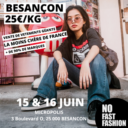 sam. 15/06/2024 - 09:00 - dim. 16/06/2024 - 17:00 2024-06-15 08:00:00 2024-06-16 16:00:00 Europe/Paris VENTE DE VÊTEMENTS DE MARQUES GÉANTE VENTE DE VÊTEMENTS DE MARQUES GÉANTE (PRIX DE GROS) - LA MOINS CHÈRE DE FRANCE ARRIVE À BESANÇON !No Fast Fashion c’est quoi ? 700 m2 de vêtem... Micropolis - 3 Boulevard Ouest 25000 Besançon NO FAST FASHIONr