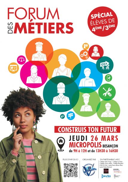 jeu. 26/03/2026 2026-03-26 15:30:00 2026-03-26 15:30:00 Europe/Paris FORUM DES METIERS Le Forum des métiers organisé par le Collège Voltaire aura lieu le Jeudi 26/03 de 9h à 16h30. Ce sont pas moins de 95 professionnels et établisse... Micropolis - 3 Boulevard Ouest 25000 Besançon COLLEGE VOLTAIREr
