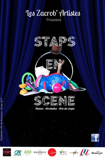 Découvrez la vie rangée et dérangée d’un « Stapsien », du lever au coucher et des cours aux soirées, à travers une mise en scène poétique et entraînante. Danses, musiques, acrobaties, jonglages, jeux de lumières et bien d’autres originalités vous surprendront dans ce spectacle conçu et représenté par plus de 40 étudiants de Bourgogne, réunis dans la troupe Zacrob’Artistes. Déjà un succès à Dijon et au Creusot, « Staps en Scène » traverse les régions grâce à l’investissement des étudiants bisontins de la filière Management du Sport et de l’Association Sportive de l’Université. Le 4 Mai 2017, sur la grande scène de Micropolis, vous pourrez assister à une représentation qui se veut ouverte à tous, familles, groupes scolaires et associatifs, étudiants et amateurs en tout genre.