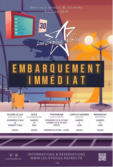 "Dernier appel avant embarquement ! Pour fêter les 30 ans de la troupe, Les Étoiles Noires partent prochainement en voyage. Une belle occasion de diffuser le message qui les unit, aux 4 coins de la planète ! Moments d’évasion, sensations de liberté… Départ imminent pour de belles émotions, sans décalage horaire. Et pourquoi pas une petite escale dans le temps, au gré des souvenirs qui rassemblent des dizaines d’aventuriers de l’Espoir ? Avis à tous les Globe-Trotters, au public de la première heure : Quel beau chemin nous avons déjà parcouru… Ensemble !"